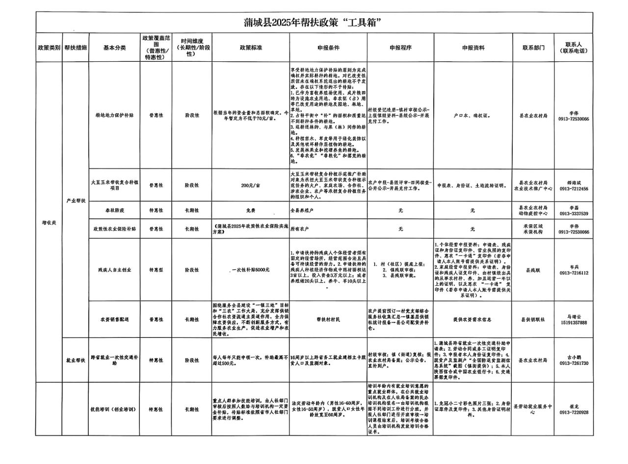 为坚决守住不发生规模性返贫底线,切实提升群众对帮扶政策的知晓度与获得感,确保各项惠民措施精准落地、有效帮扶,现将蒲城县防止返贫监测对象主要帮扶政策“工具箱”公告如下。本“工具箱”汇总了涉及产业帮扶、就业帮扶、金融帮扶、公益岗位帮扶、住房安全保障、健康帮扶、饮水安全保障、义务教育保障、兜底保障及其他政策等关键领域的帮扶措施,并明确了各项政策的享受条件、申报程序、所需材料及联系部门/电话,方便群众及时了解、按需申请。