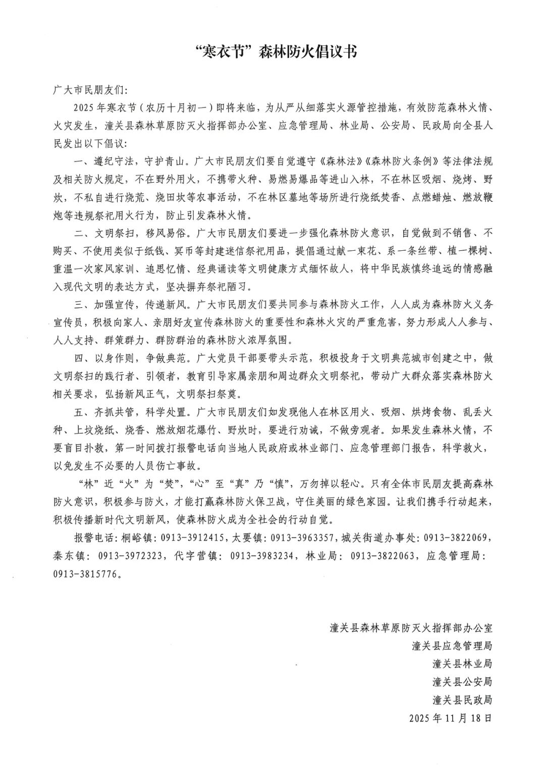 渭南潼关太要镇:“寒衣节”森林防火倡议书